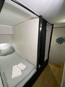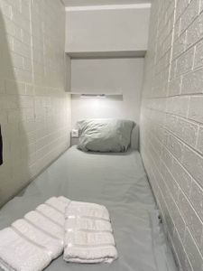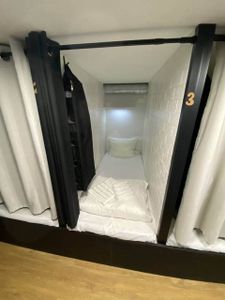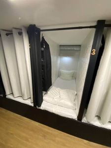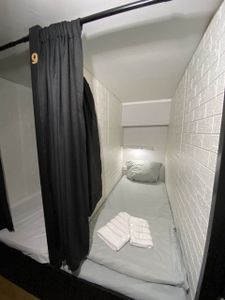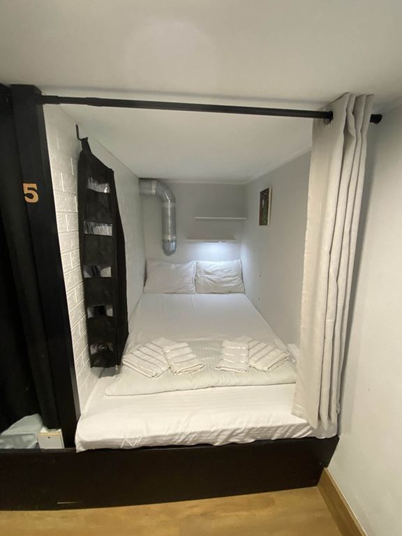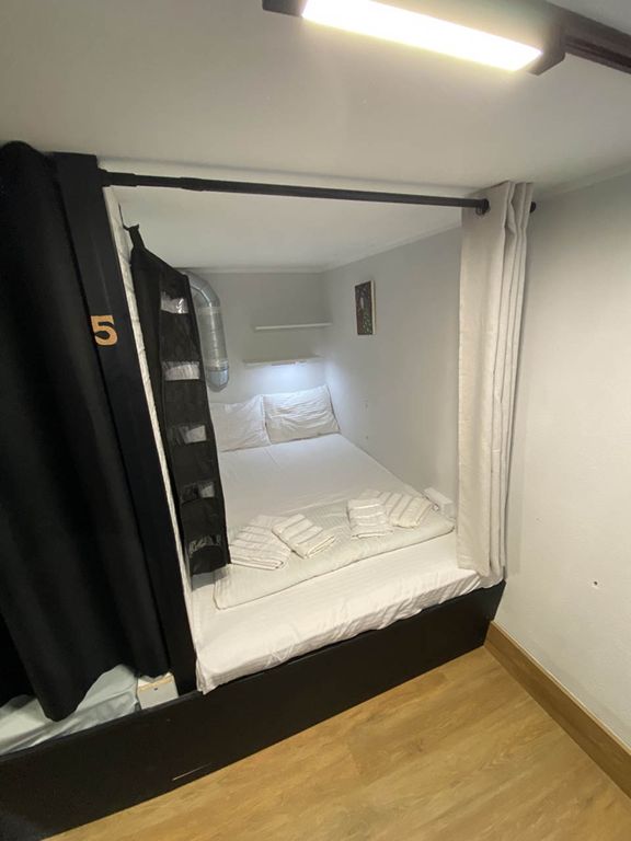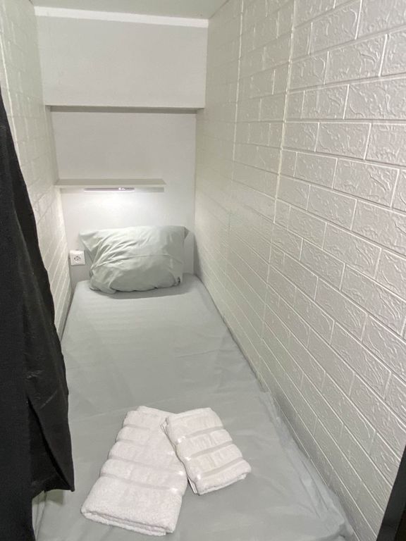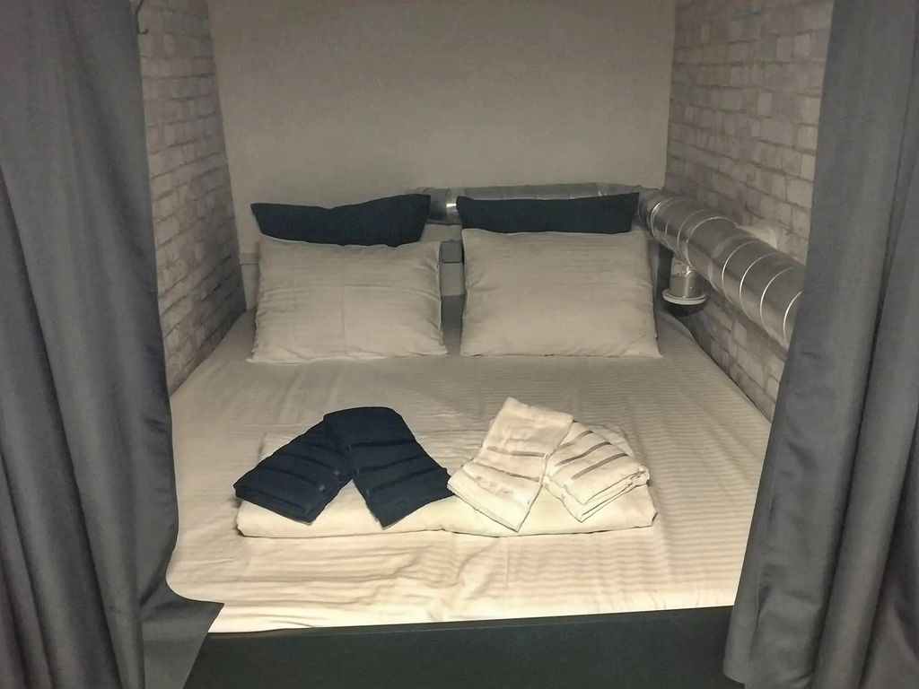- Уютные капсулы: новые матрасы, комплект свежего постельного белья + два полотенца, полочки, свет, розетки, кофр для хранения личных вещей